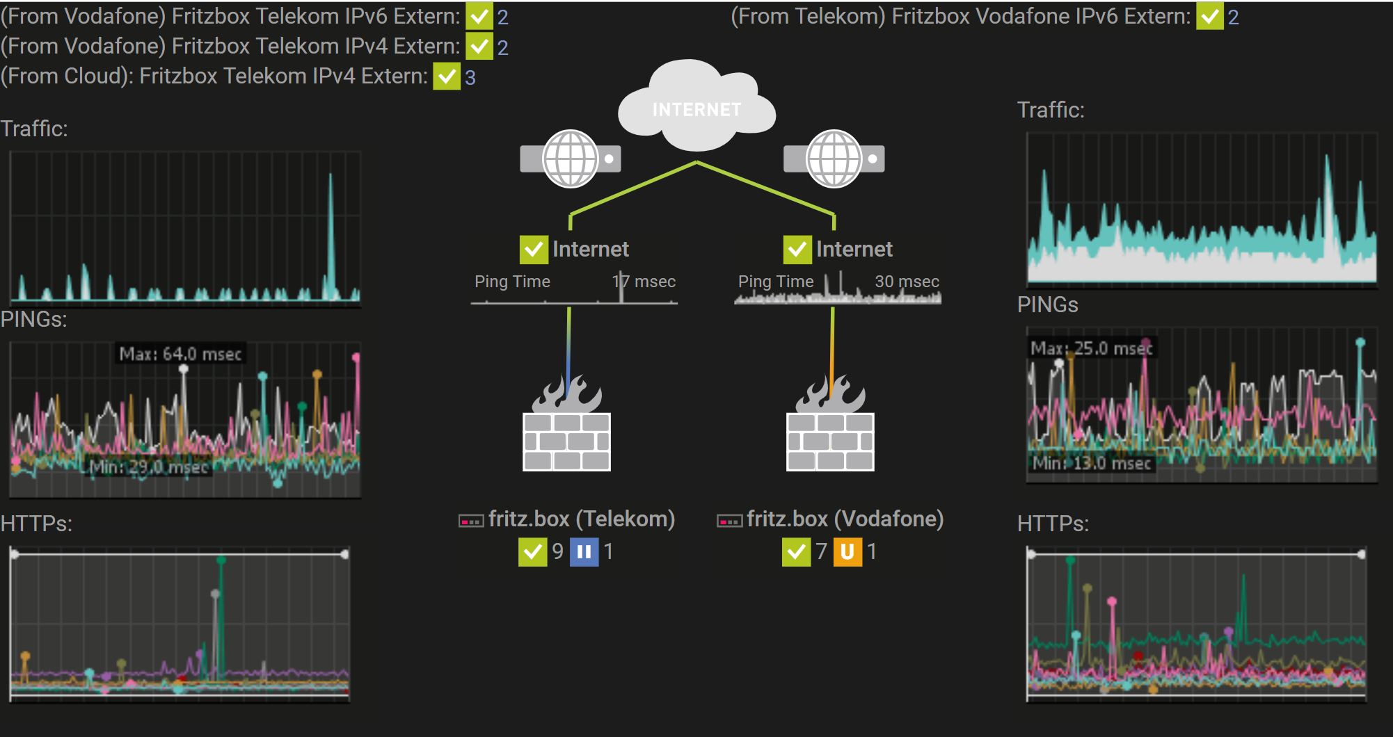 In diesem Blogpost beschreibe ich, wie ich meine beiden AVM Fritzboxen (Fritzbox 7590 mit Telekom VDSL-Zugang und Fritzbox 6490 mit Vodafone Kabelzugang) überwache, und zwar von innen und von außen.