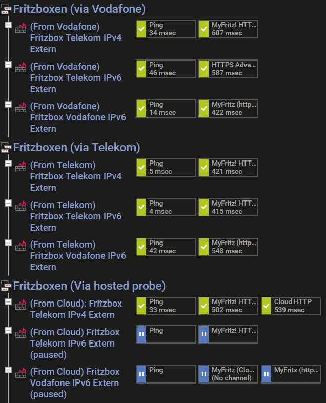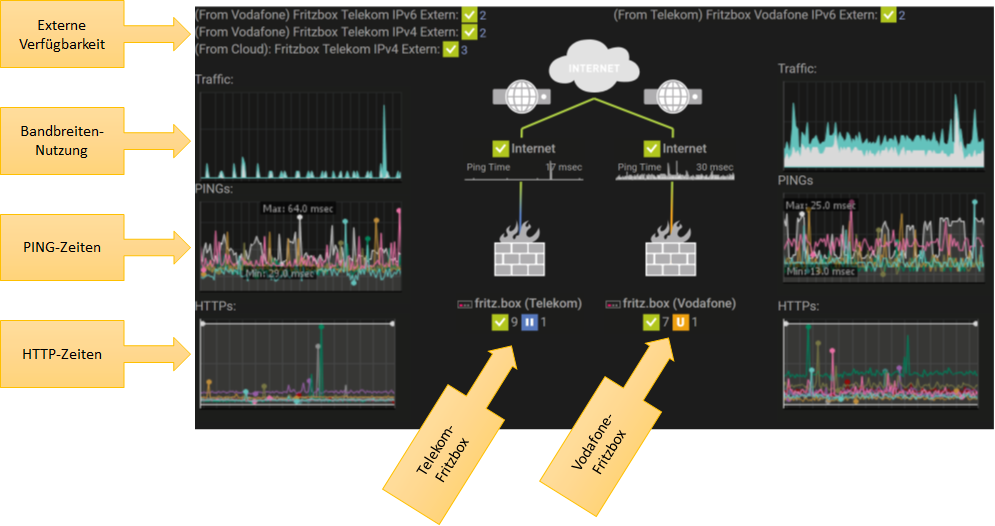 An beiden Zugängen hängt jeweils eine AVM Fritzbox. Fritzboxen sind leider aus Sicht einer Monitoring-Software sehr unhandliche Geräte, da sie bis auf PING und HTTP Zugang keinen der üblichen Überwachungs-Standards unterstützen, wie z.B. SNMP. Also muss man sich anders behelfen.