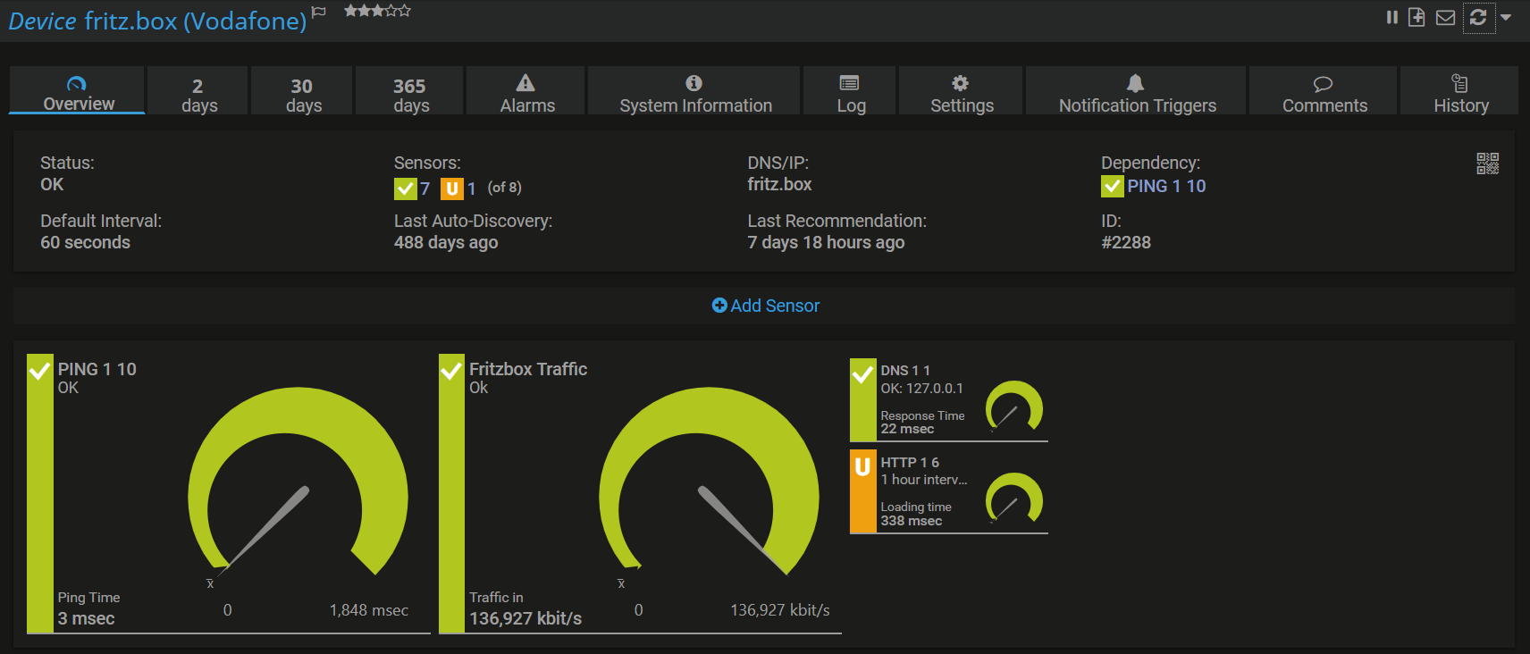 Für die Überwachung der Fritzbox lege ich ein Device an mit dem DNS-Namen “fritz.box”. Mit den Bordwerkzeugen von PRTG kann ich einen PING und einen HTTP Sensor anlegen und bekomme damit schon mal mit, ob die Box überhaupt am Netz hängt. Außerdem überwache ich den DNS Server der Fritzbox.