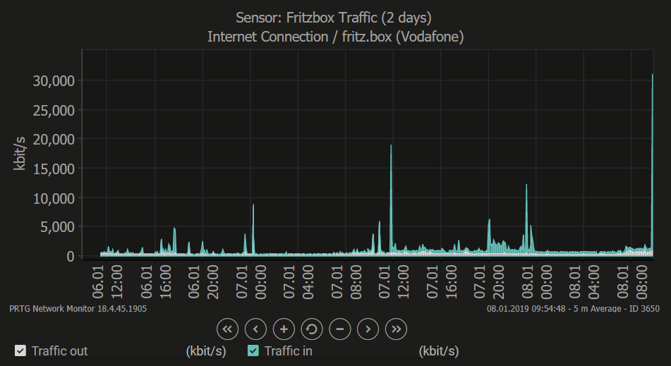 Unser Haus hat zwei Internetzugänge, einmal einen Vodafone Kabel Zugang mit 400 Mbit/s und einen Telekom VDSL Zugang mit 50 Mbit/s. Wenn einer ausfällt, verwenden wir einfach den anderen. Damit wir auch umgehend mitbekommen, wenn ein Zugang ausfällt oder Probleme macht, überwache ich beide Internetzugänge mit PRTG. Dabei möchte ich die Verfügbarkeit ebenso beobachten wie die Antwortzeiten und Bandbreiten-Auslastung.