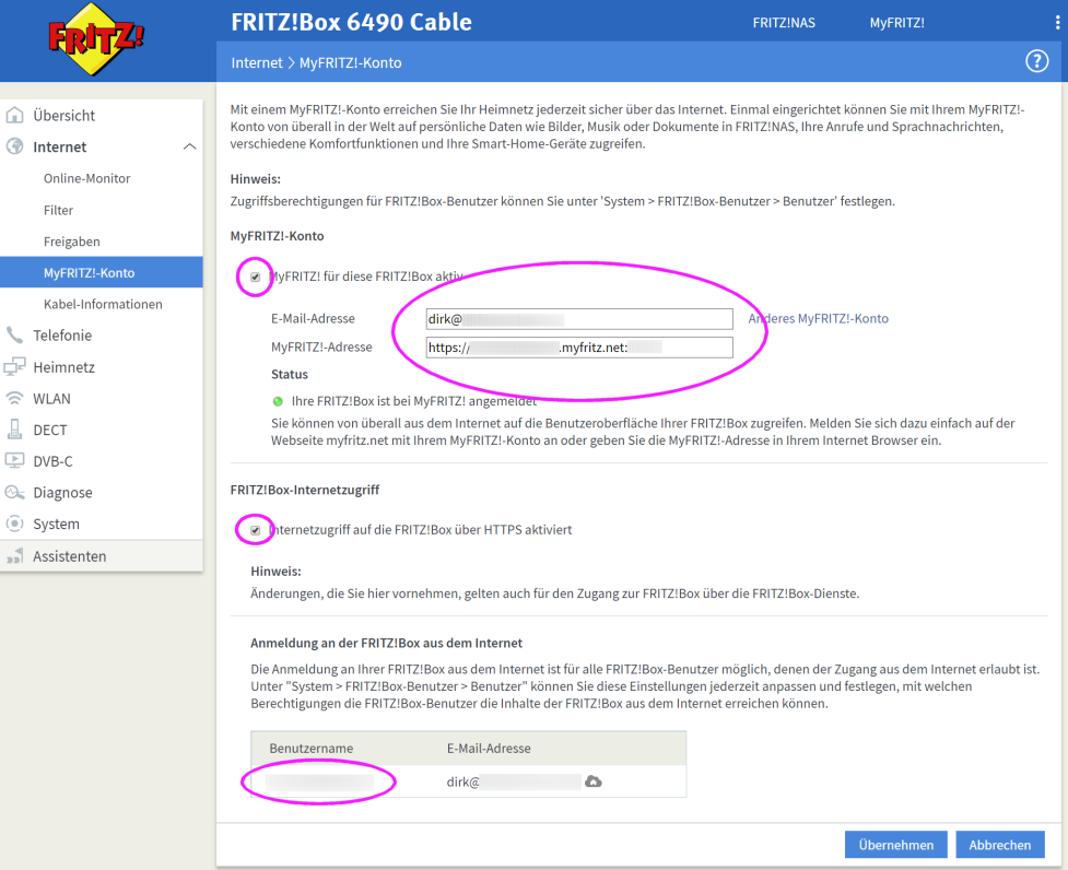 Man geht also ins Web-Interface der Fritzbox in den Bereich Internet/MyFritz!-Konto und schaltet “MyFRITZ! für diese FRITZ!Box aktiv” ein. Nach kurzer Zeit erhält man eine MyFritz!-Adresse die irgendwie wie folgt aussieht: