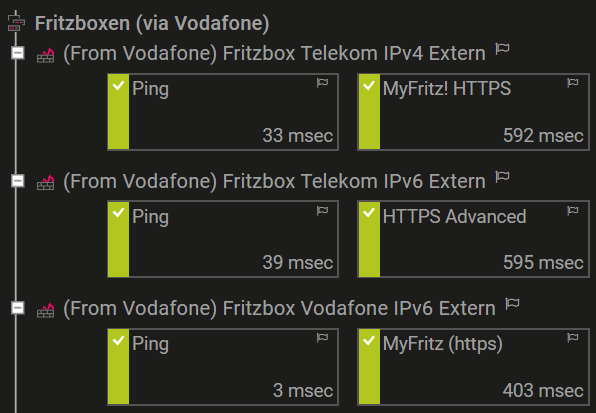 Dann merkte ich: Die Vodafone Fritzbox ist von außen nicht per IPv4 zu erreichen. Weil Vodafone seinen Kunden keine öffentlichen IPv4-Adressen mehr zuteilt und nur noch alles über IPv6 abwickelt. Also kann ich diesen Zugang von außen nur über IPv6 überwachen.