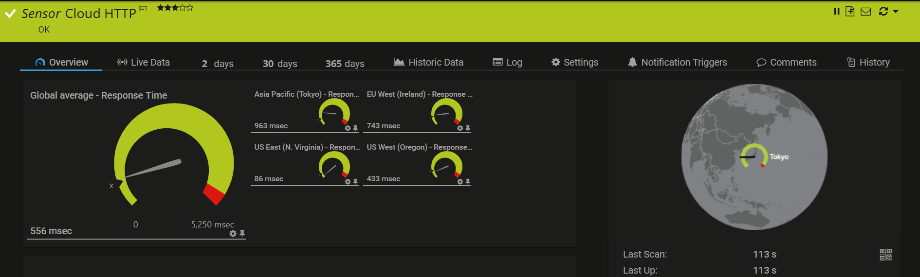 Leider kann die Hosted Probe z.Zt. kein IPv6, ich kann also meinen Vodafone-Zugang nicht prüfen. Aber dafür konnte ich in der Cloud noch einen Cloud HTTP Sensor anlegen, der meine Telekom-Fritzbox aus der ganzen Welt überwacht (aus Japan, Virginia, Oregon, und Irland):