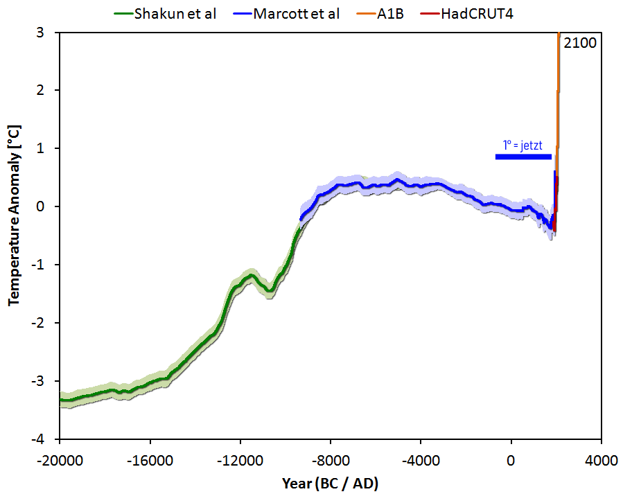 Die sich durch Treibhausgase ergebende Erwärmung ist sowohl in ihrer Temperatur-Differenz als auch in ihrer Geschwindigkeit ohne Beispiel in der Vergangenheit. Der folgende Graph zeigt die Entwicklung der globalen Temperatur der letzten 20.000 Jahre. Der blaue Bereich zeigt den Zeitraum nach der letzten Eiszeit in der sich unsere gesamte Zivilisation entwickelt hat. Das ist die “sichere Zone”, damit kommen die Menschen klar. Aber seit etwa 100 Jahren bewegen wir uns steil nach oben (rote Linie).