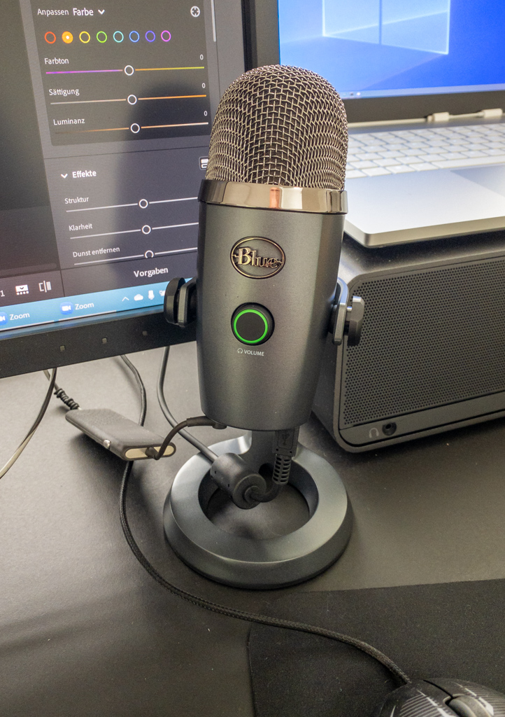 Für das Mikrofon habe ich noch einen €34-Ständer beschafft, so gibt es weniger Nebengeräusche und das Mikrofon steht vor dem Monitor nicht im Weg.