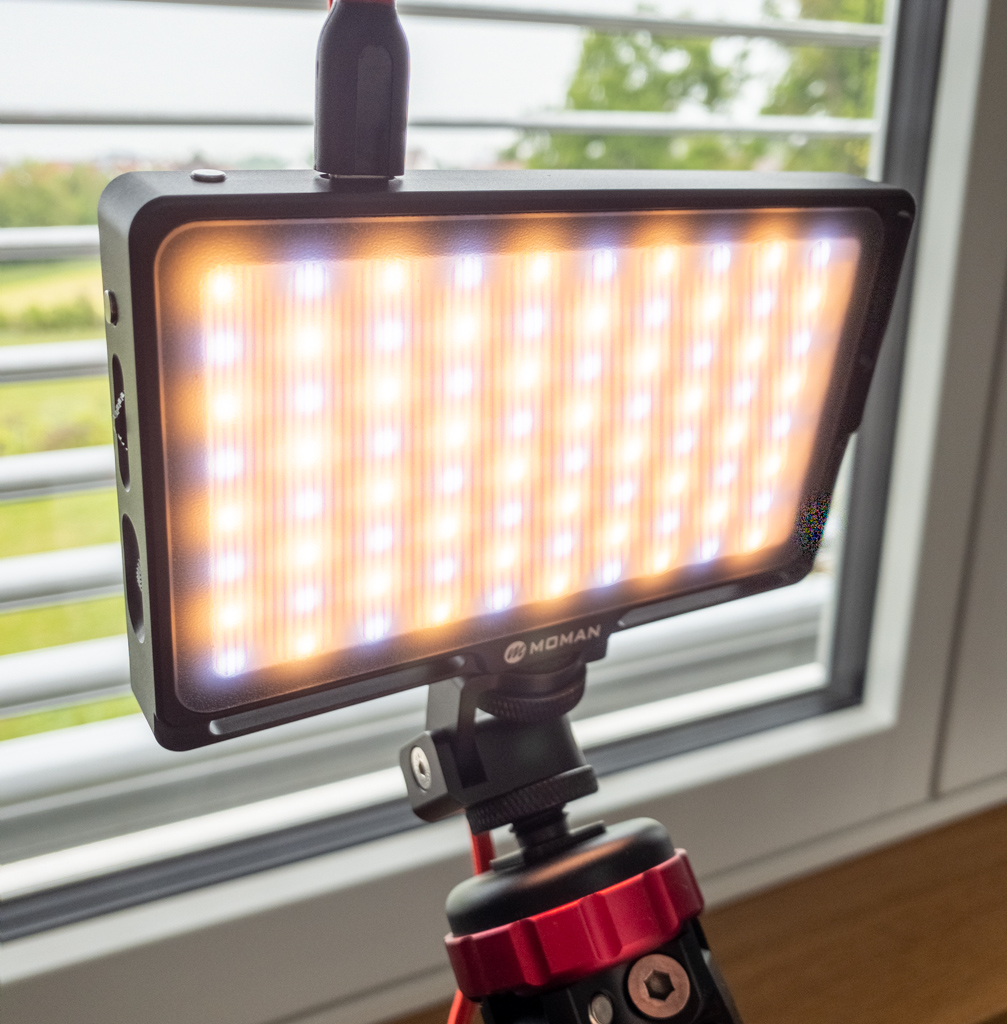 Hinter dem Monitor ist ein großes (Nord-) Fenster, das ich für Video-Konferenzen öffne. Abends hilft wenn nötig die Foto-Leuchte hinter der Kamera, um mein Gesicht gut zu belichten: