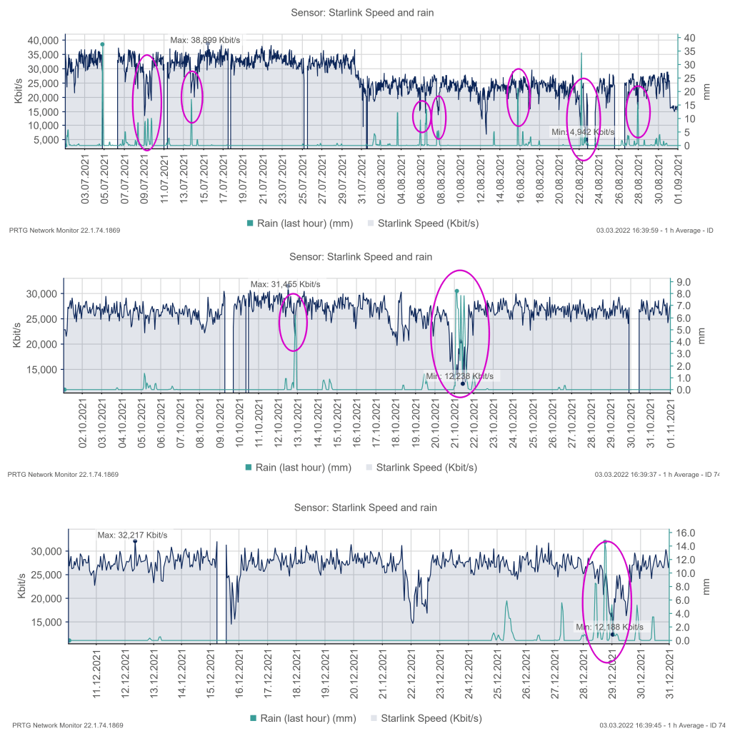 Weil sich bei starkem Regen Millionen kleine Regentropfen als Dipole zwischen dem Satelliten und der Antenne befinden, könnte man erwarten, dass die Übertragungs-Geschwindigkeit bei Regen sinkt. Und das kann man durchaus aus den folgenden Graphen rauslesen (markierte Zeiträume), insbesondere bei Starkregen-Ereignissen wie am 22.8., 28.8., 12.10., 21.10. oder 28.12. (Schneefall). Aber eben auch nicht immer, es gibt auch viele stärkere Regenereignisse, bei denen keine Absenkung der Bandbreite sichtbar ist. In den meisten Fällen liegen die wetterbedingten Schwankung unterhalb dessen, was sonst an Schwankungen der Bandbreite vorhanden ist.