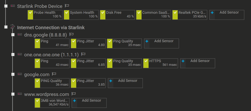 Während die beiden kabelbasierten Interzugänge auf 99,5% Verfügbarkeit kommen, was wohl nicht schlecht ist für Consumer-grade Technik, schafft Starlink nur 95%. ABER: Dieser Messwert liegt viel zu niedrig, denn: Die Zeitlöcher sind alle immer dann entstanden, wenn der Rechner mit der PRTG-Probe die Verbindung verloren hatte. Sobald man dessen Strom ein/aus geschaltet hat, ging es sofort wieder weiter. Ob es sich hier um ein Starlink-spezifisches Problem handelt habe ich (noch) nicht weiter erforscht, wenn der Zugang klemmt starte ich z.Zt. per smart-Steckdose den Probe Rechner manuell.