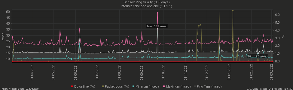 Ich verwende einen PING Sensor der alle 60 Sekunden 50 PINGs an den Server 1.1.1.1 (Cloudflare DNS Server) sendet und dann die Min/Avg/Max-Werte der Pingzeiten bestimmt und den Packet-Loss berechnet. Hier die Ergebnisse als tägliche Mittelwerte: