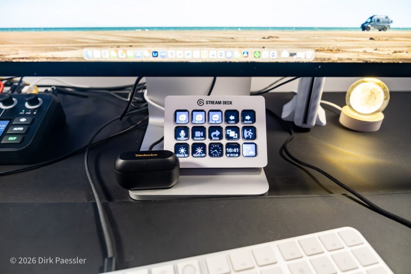 Beneath the monitor I have this small device, Elgato Streamdeck, €139, with 15 buttons on it. Without using my mouse I can…