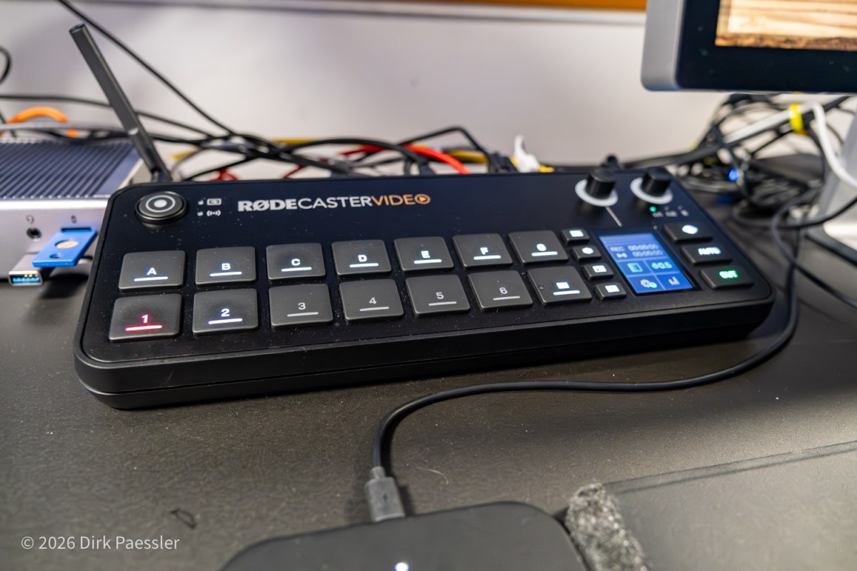 The central device in my setup is a “video switcher”, or better, a small video production studio on steroids, the RØDECaster Video, €850.