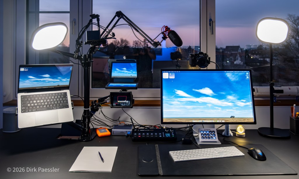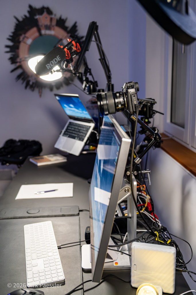 Here I am also using an APS-C camera, FUJIFILM X-T3, with a zoom lens so I can adapt the field of view on the fly. It is mounted to the Apple Studiodisplay using a SmallRig Magic Arm, €35.